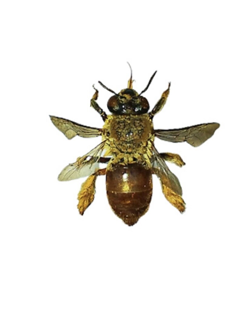Two bees dominate cashew pollination: the introduced honeybee (Apis mellifera) and the native oil-collecting bee Centris tarsata. While honeybees visit more frequently, Centris tarsata proves more efficient, carrying twice as much pollen per foraging trip. The native bee's specialized behavior makes it particularly effective at cross-pollination. Studies in commercial plantations have documented diverse pollinator communities including stingless bees (Meliponula bocandei) and mason bees (Anthidium spp.). Dos abejas dominan la polinización del marañón: la abeja melífera introducida (Apis mellifera) y la abeja recolectora de aceite nativa Centris tarsata. Mientras que las abejas melíferas visitan con más frecuencia, Centris tarsata resulta más eficiente, transportando el doble de polen por viaje de forrajeo. El comportamiento especializado de la abeja nativa la hace particularmente efectiva en la polinización cruzada. Los estudios en plantaciones comerciales han documentado diversas comunidades de polinizadores incluyendo abejas sin aguijón (Meliponula bocandei) y abejas albañiles (Anthidium spp.).