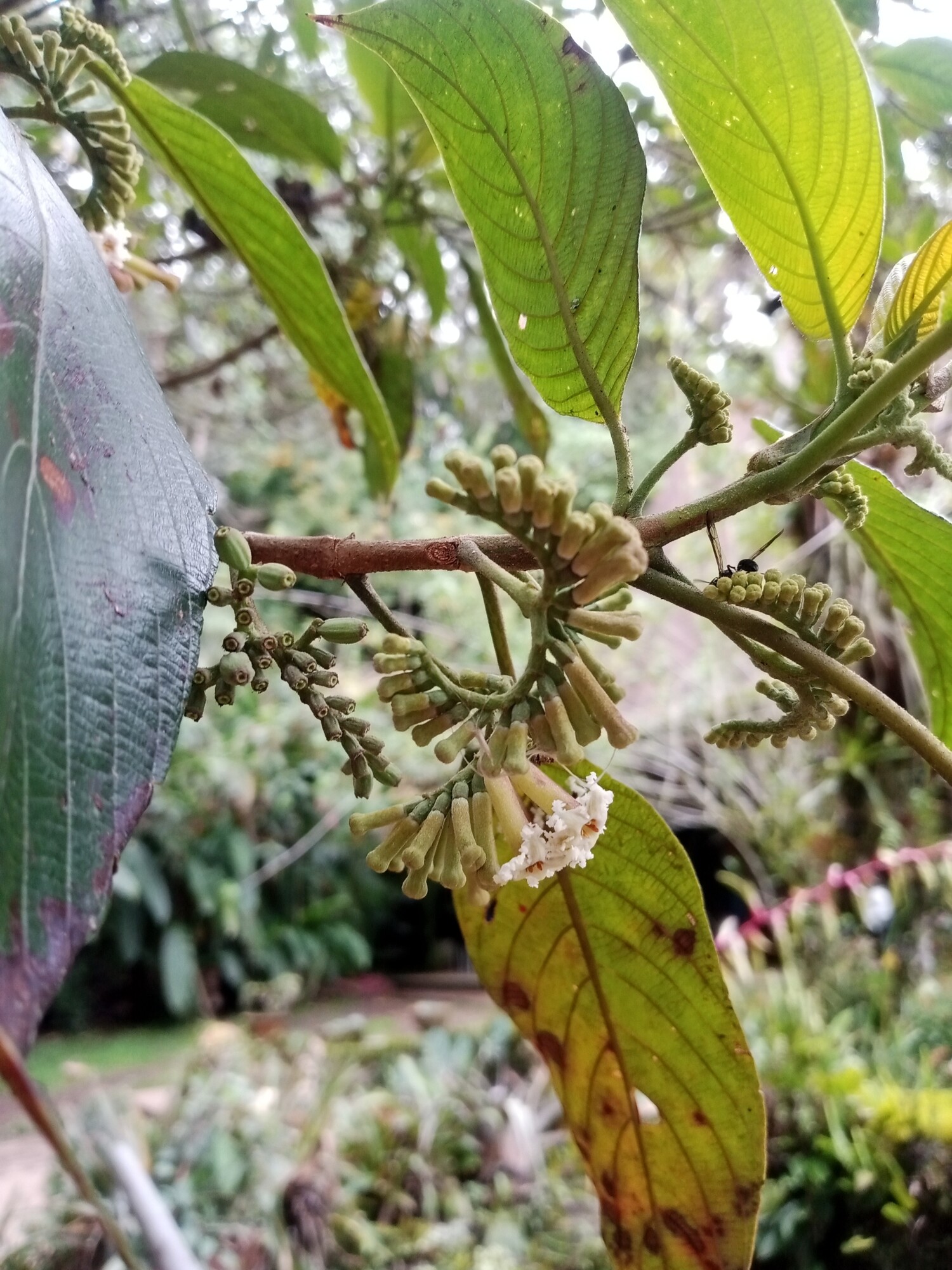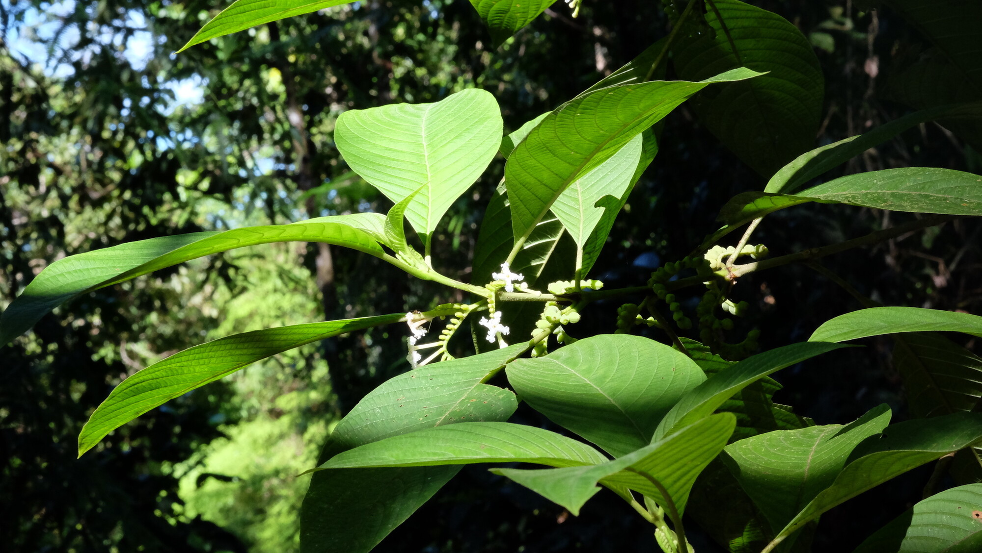 Leaves are simple, opposite, and arranged in decussate pairs as is diagnostic for the coffee family. The blades are ovate-elliptic, 6-22 cm long and 4-13 cm wide, with entire margins and an acute to acuminate apex. The upper surface is dark green and glabrous or nearly so, while the lower surface is paler with pubescence along the veins. Secondary venation is prominent, with 6-10 pairs of lateral veins curving toward the apex in a characteristic pattern. Interpetiolar stipules, the hallmark of Rubiaceae, are present at each node. Las hojas son simples, opuestas y dispuestas en pares decusados como es diagnóstico de la familia del café. Las láminas son ovado-elípticas, de 6-22 cm de largo y 4-13 cm de ancho, con márgenes enteros y ápice agudo a acuminado. La superficie superior es verde oscuro y glabra o casi glabra, mientras que la superficie inferior es más pálida con pubescencia a lo largo de las venas. La venación secundaria es prominente, con 6-10 pares de venas laterales curvándose hacia el ápice en un patrón característico. Las estípulas interpeciolares, la marca distintiva de las Rubiaceae, están presentes en cada nudo.
