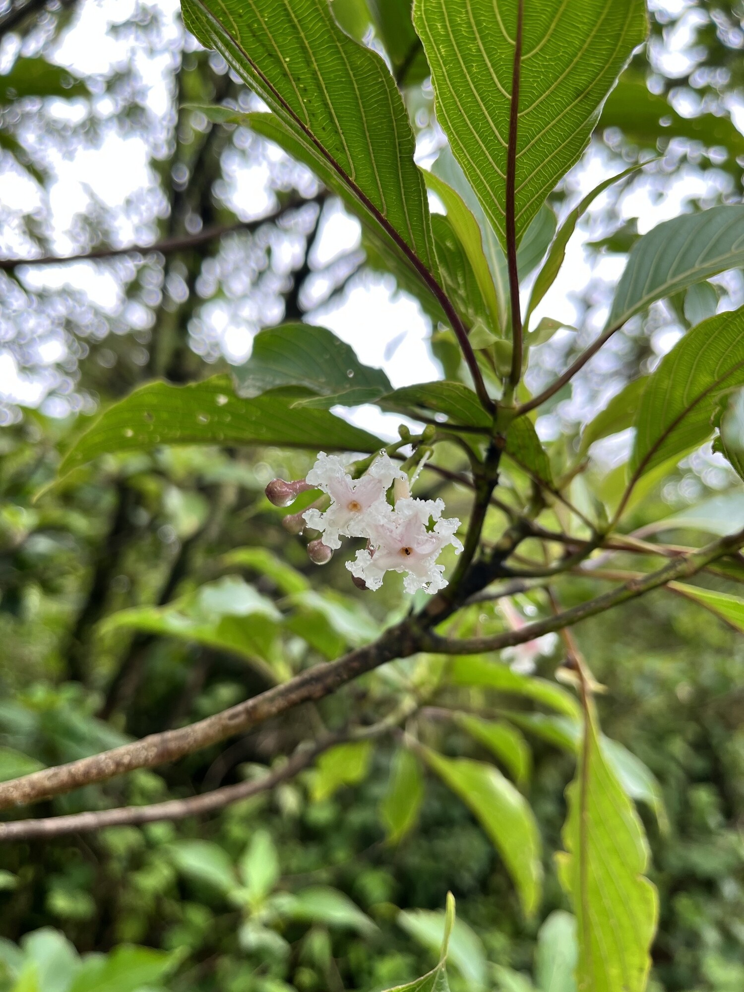 Guettarda crispiflora grows as a small to medium-sized tree typically reaching 5-15 meters, though specimens up to 20 meters have been recorded. The bark is cream to brown and exfoliates in thin layers. Young branches are covered with dense pubescence that becomes sparser with age. The species occupies the understory and midstory of humid forests, tolerating the low light conditions beneath the main canopy. Guettarda crispiflora crece como un árbol pequeño a mediano que típicamente alcanza 5-15 metros, aunque se han registrado espécimenes de hasta 20 metros. La corteza es crema a marrón y se exfolia en capas delgadas. Las ramas jóvenes están cubiertas con pubescencia densa que se vuelve más escasa con la edad. La especie ocupa el sotobosque y el estrato medio de los bosques húmedos, tolerando las condiciones de baja luz debajo del dosel principal.
