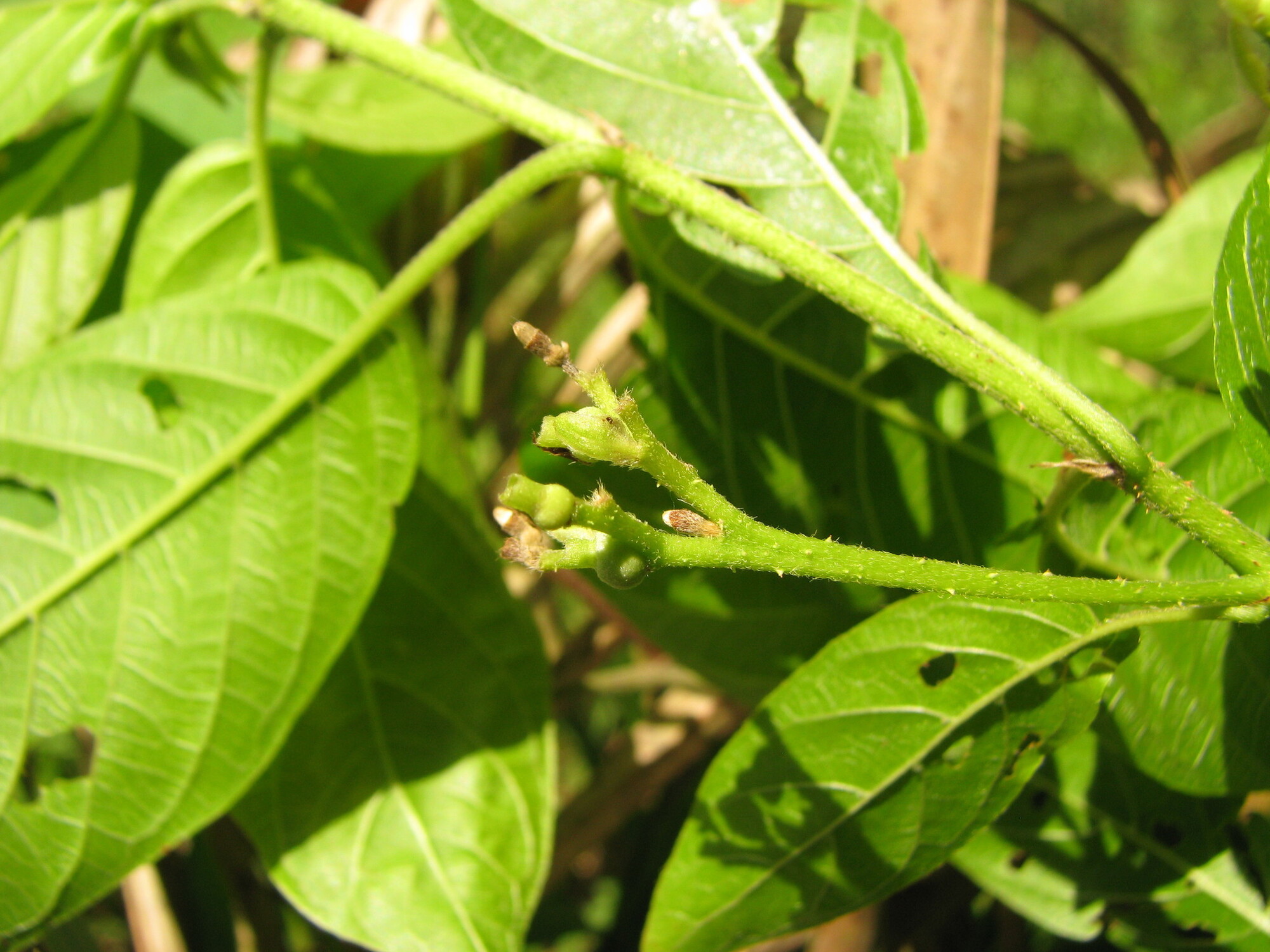 Guettarda foliacea typically grows as a shrub or small tree 3-6 meters tall, occasionally reaching 10 meters in favorable conditions. Some individuals may reach greater heights in favorable conditions. The growth form is often multi-stemmed, branching from the base with somewhat clambering branches. Young stems are covered with appressed hairs (strigose), becoming smooth with age. Branch spines, when present, can reach 5 cm in length, though spines are rarely observed on herbarium specimens. Guettarda foliacea típicamente crece como un arbusto o árbol pequeño de 3-6 metros de altura, ocasionalmente alcanzando 10 metros en condiciones favorables. Algunos individuos pueden alcanzar mayores alturas en condiciones favorables. La forma de crecimiento es frecuentemente multi-ramificada, ramificándose desde la base con ramas algo trepadoras. Los tallos jóvenes están cubiertos con pelos adpresos (estrigosos), volviéndose lisos con la edad. Las espinas de las ramas, cuando están presentes, pueden alcanzar 5 cm de largo, aunque rara vez se observan espinas en especímenes de herbario.